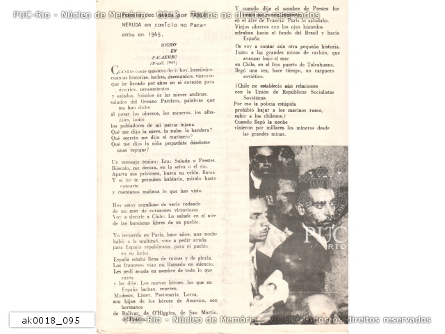 Poesia declamada por Pablo Neruda em comício no Pacaembu em 1945. Panfleto sobre Luiz Carlos Prestes, possivelmente distribuído após a volta de Prestes ao Brasil, no final de 1979. |