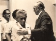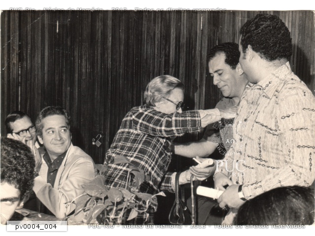 Adalberto Pereira, prefeito do campus da PUC-Rio, recebe, através do reitor Padre MacDowell S.J., a homenagem e o cumprimento da Universidade pelos mais de vinte anos de trabalho dedicados a ela. |