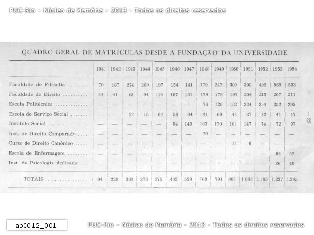 Quadro geral de matrículas por faculdades, escolas e institutos da PUC-Rio do ano de 1941 até 1954. |