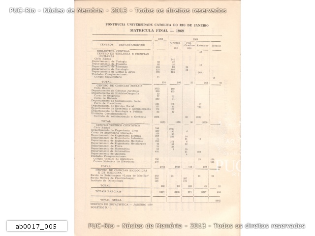 Quadro com a quantidade final de matrículas por centro, dos anos de 1968 e 1969. Graduação, pós-graduação, extensão e "médios", isso é, cursos técnicos oferecidos pela Universidade. |