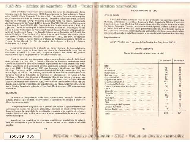 Histórico, objetivos, programas de estudos e quadro do corpo discente do ano de 1972 dos curso de pós-graduação da PUC-Rio. |