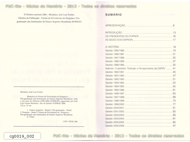 Ficha catalográfica e Sumário do livro Memória do Fórum de Pró-reitores de Pesquisa e Pós-graduação das Instituições de Ensino Superior Brasileiras. |