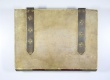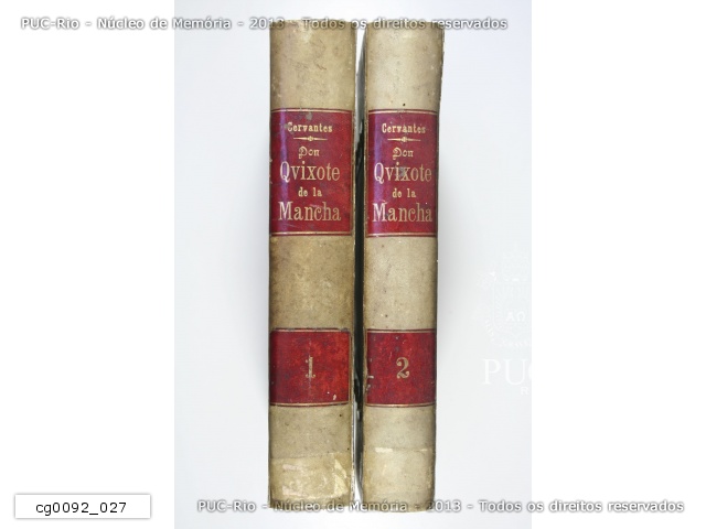 Foto da Edição Princeps da obra de Miguel de Cervantes Saavedra, El ingenioso hidalgo Don Qvixote de la Mancha, [1. ed.] Madrid: Iuan de la Cuesta, 1605-1615. 2 v. Capa de pergaminho, fecho de metal. |