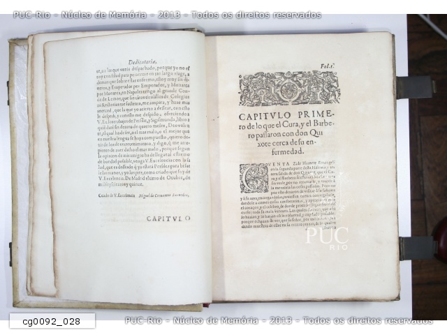 Foto da Edição Princeps da obra de Miguel de Cervantes Saavedra, El ingenioso hidalgo Don Qvixote de la Mancha, [1. ed.] Madrid: Iuan de la Cuesta, 1605-1615. 2 v. Capa de pergaminho, fecho de metal. Livro aberto no primeiro capítulo da segunda parte. |