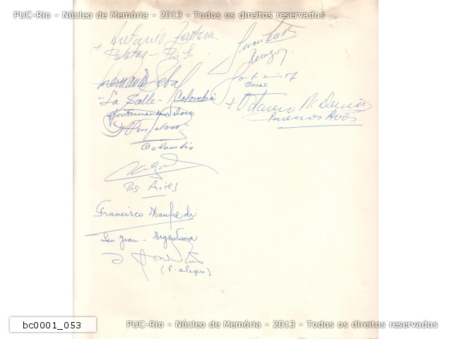 Verso com assinaturas de participantes do VI Congresso e VII Assembléia ODUCAL (Asociación de universidades católicas de América Latina y el Caribe). 12 a 16 de Julho de 1971. |