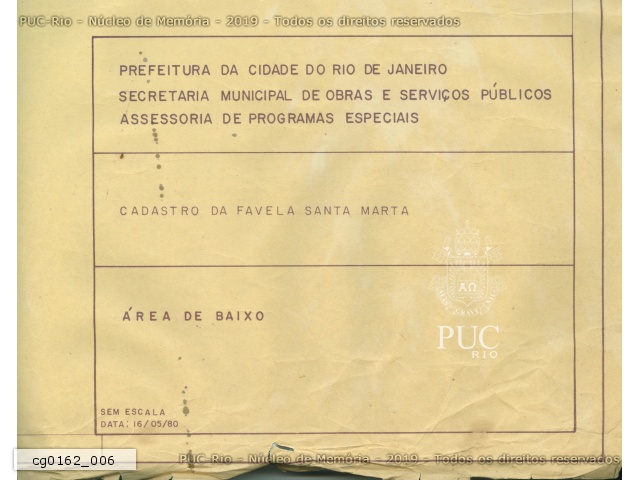 Mapa esquemático do Morro Santa Marta. Quadro com a autoria: "Prefeitura da Cidade do Rio de Janeiro, Secretaria de Obras e Serviços Públicos, Assessoria de Programas Especiais". "Cadastro da Favela Santa Marta". "Àrea de baixo". |