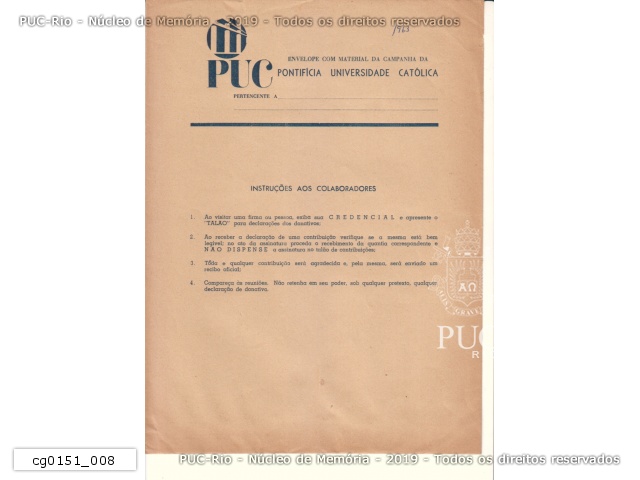 Envelope com material da campanha financeira da Universidade Católica. Direcionado aos colaboradores, com instruções sobre como coletar os donativos. |