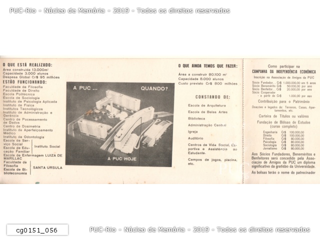 Verso do recibo de doação para a Campanha Financeira da PUC-Rio. Breve balanço do que "está realizado" (área construída de 13mil m2 e 3mil alunos) e do que está funcionando (institutos e faculdades). "O que ainda temos que fazer", prevendo "área a construir 80.100 m2" e "Capacidade 8.000 alunos". Previstos: Escola de Arquitetura, Escola de Belas Artes, biblioteca, igreja, auditório, campos de jogos, piscina. "Como participar da campanha de independência econômica". Foto da maquete do Campus Gávea. |