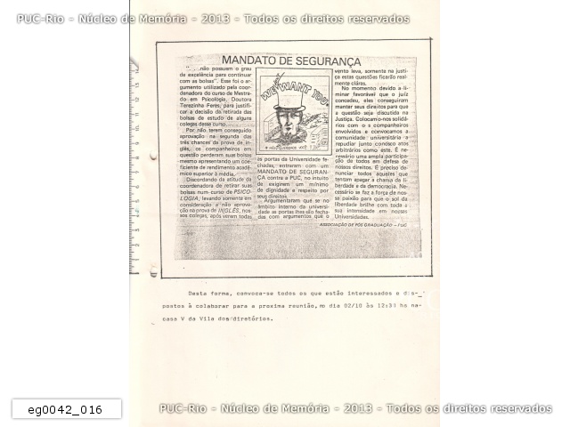 Ata da reunião "visando a reativação dos trabalhos" da APG. Cópia de folheto da APG sobre o Mandato de Segurança impetrado por alunos que tiveram as bolsas retiradas por não terem sido aprovados, pela segunda vez, na prova de inglês. Charge com a cabeça do Tio Sam no meio do campus da PUC-Rio. |