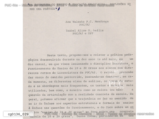 Início do artigo “Da estrutura do ensino à educação brasileira: reflexões sobre uma prática” de autoria das professoras Ana Waleska Mendonça e Isabel Alice Lellis, apresentado no seminário dos 20 anos do mestrado em Educação da PUC-Rio. Texto integral disponível no site do Núcleo de Memória. |