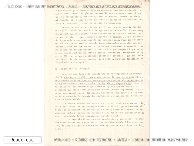 Diretrizes Acadêmicas para 1983/1984 Centro Técnico Científico. Conclusão da Introdução. Histórico sobre a situação do CTC desde 1981, com a ameaça às fontes de financiamento, em particular a fonte Finep. Sobre o curso de "Engenharia de Concepção". |