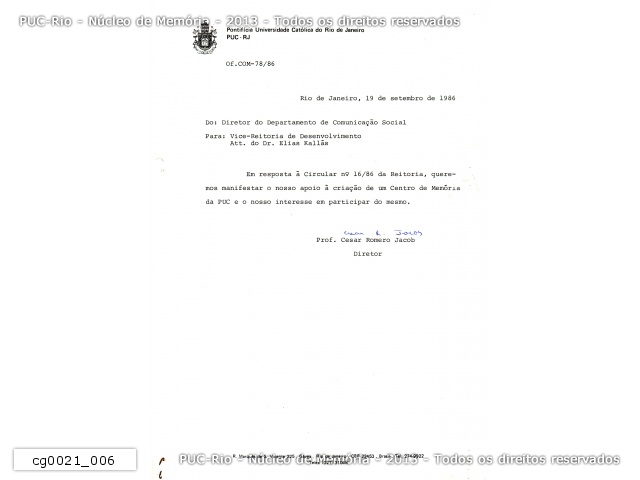Correspondência interna de autoria do diretor do Departamento de Comunicação Social, prof. Cesar Romero Jacob, para a Vice-Reitoria de Desenvolvimento, em resposta à circular enviada pelo Reitor sobre o Centro de Memórias. |