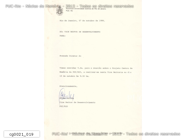 Correspondência interna de autoria do Vice-Reitor Acadêmico, prof. Elias Kallás, convidando diretor de departamento para reunião sobre o Projeto Centro de Memória da PUC/RJ. |