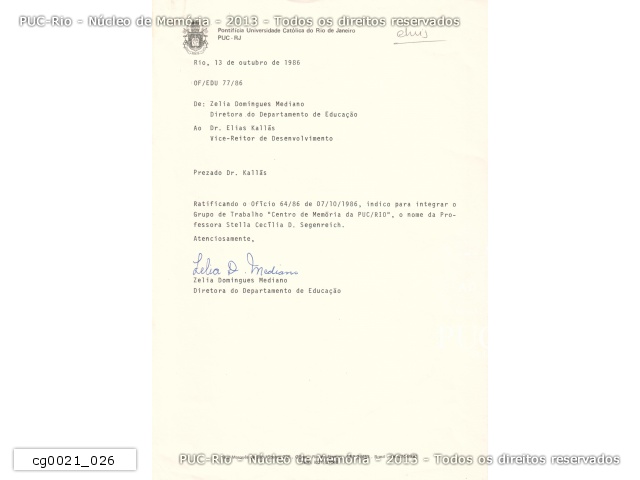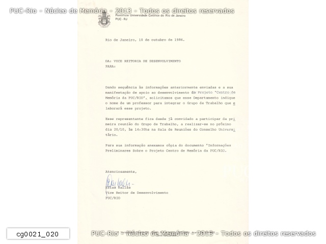 Correspondência interna de autoria do Vice-Reitor Acadêmico, prof. Elias Kallás, solicitando aos diretores de departamento que nomeiem um professor para integrar o Grupo de Trabalho encarregado de elaborar o projeto para o Centro de Memória da PUC/RJ. Haveria uma reunião em 20/10/1986. |