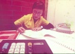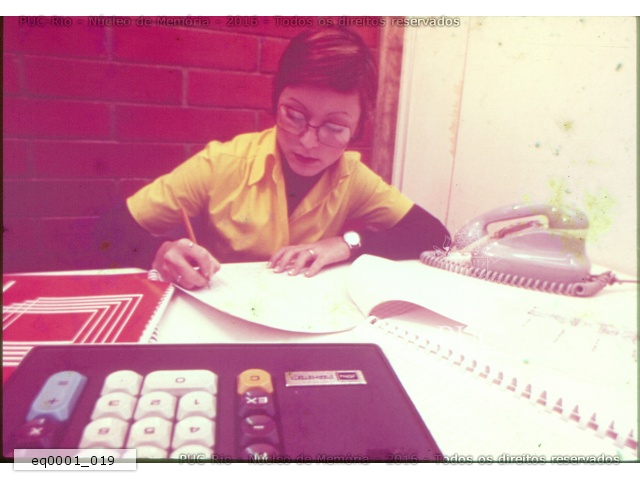 Aluna ou funcionária escreve ao lado de uma calculadora e de um telefone. Pela parede de tijolinhos, pode ser no IAG. |