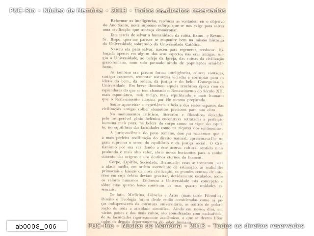 Discurso proferido pelo reitor pe. Paulo Bannwarth S.J., por ocasião da abertura solene dos cursos da Universidade Católica em 15/03/1950. |