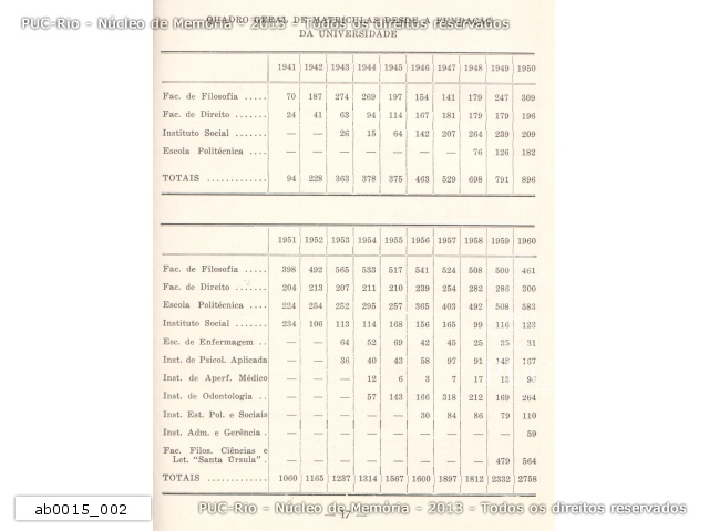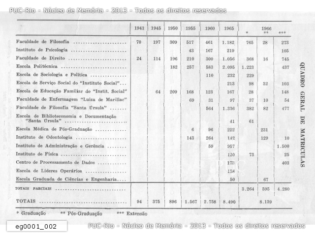 Quadro geral de matrículas por faculdades, institutos e escolas de 1941 a 1967. Inclui a Escola de Líderes Operários, o Centro de Processamento de Dados e a Escola Graduada de Ciências e Engenharia (pós-graduação). |